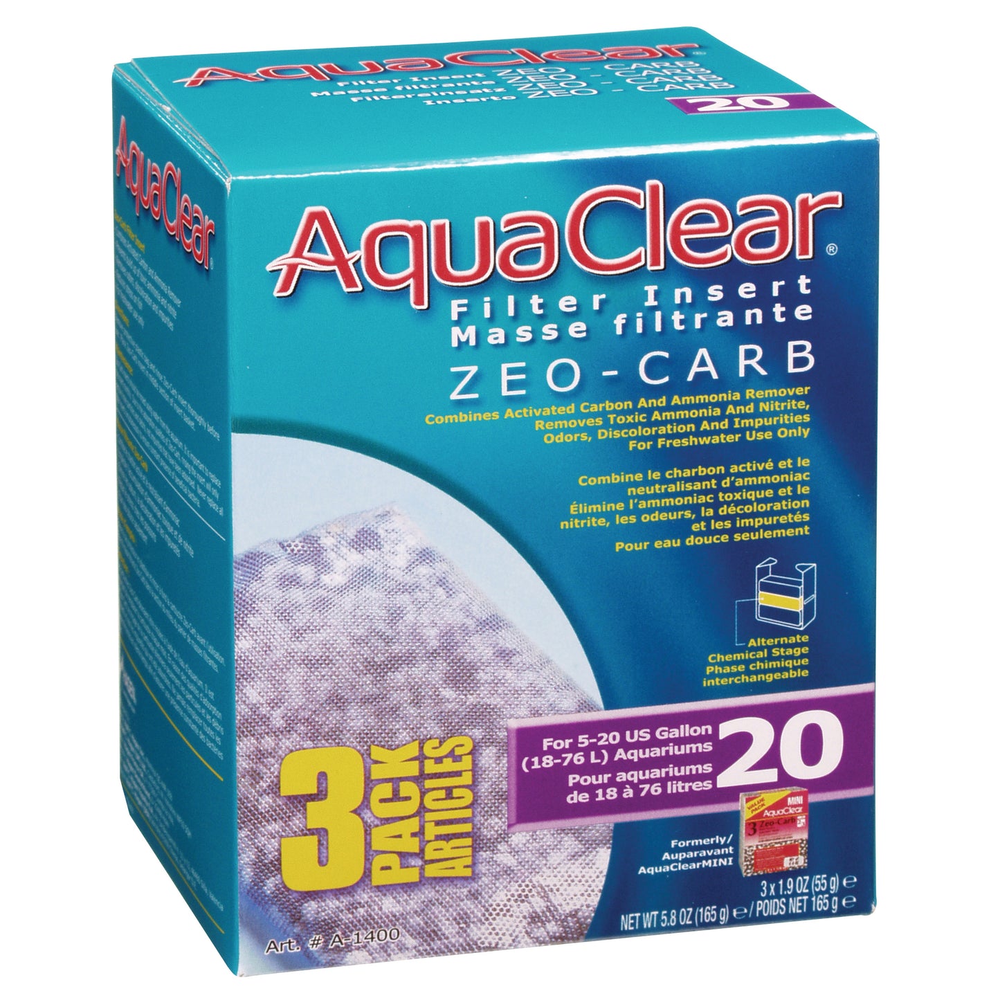 Une puissante combinaison de charbon actif et de dissolvant d'ammoniac, le filtre AquaClear Zeo-Carb élimine efficacement les odeurs, la décoloration et les impuretés dans les aquariums d'eau douce. Ce puissant duo chimique empêche l’accumulation d’ammoniac et de nitrite toxiques, produisant ainsi une eau d’aquarium propre et saine. Conçu exclusivement pour le filtre puissant AquaClear. Paquet de 3.