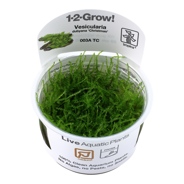 A moss speciality from Brasil, 1-3 cm tall, called "Christmas tree moss'', because of its side branch structure which distinguishes it from ordinary Vesicularia dubyana and looks like fir tree branches. It is more demanding than ordinary Java moss and grows more slowly. It attaches readily to roots and stones, and as it spreads in the water it needs pruning to keep its shape attractive. See also Taxiphyllum barbieri.